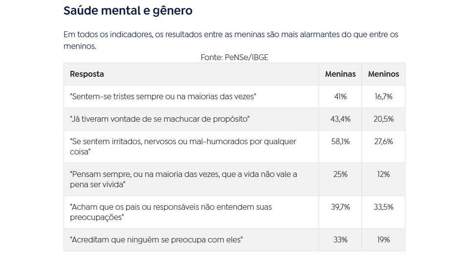 Dados da Pesquisa Nacional de Saúde do Escolar (PeNSe), divulgada pelo Instituto Brasileiro de Geografia e Estatística, mostram um cenário preocupante para a saúde mental de adolescentes brasileiros.