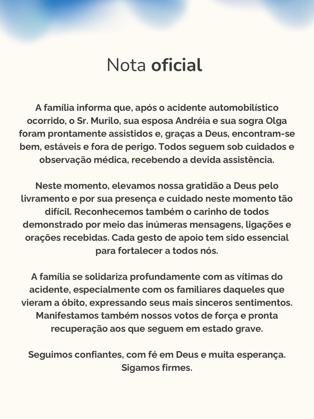 No comunicado, a família agradeceu pelas mensagens de apoio e solidariedade recebidas, além de manifestar profundo pesar pelas vítimas fatais. Também foram expressos votos de pronta recuperação aos feridos que permanecem em estado mais grave.