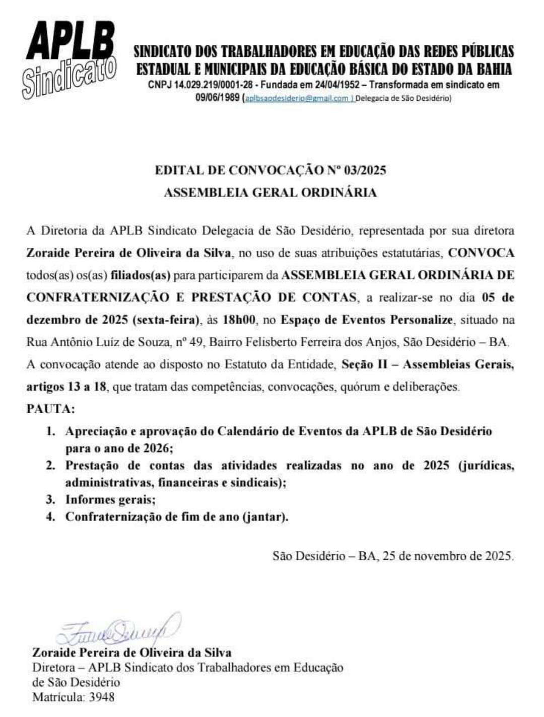APLB de São Desidério anuncia Assembleia Geral com prestação de contas e confraternização