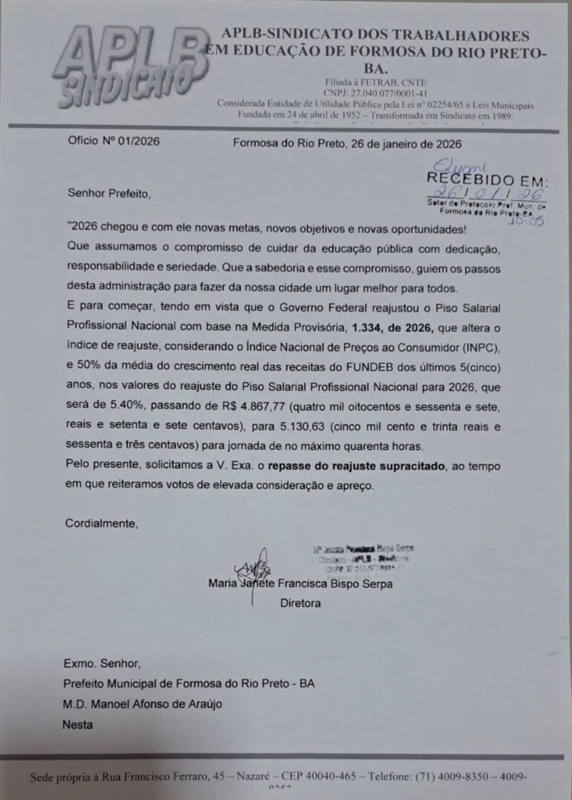A direção da APLB Sindicato dos Trabalhadores em Educação de Formosa do Rio Preto protocolou, nesta segunda-feira (26), um ofício na Prefeitura Municipal solicitando que o prefeito Neo Araújo aplique o reajuste de 5,4% no Piso Salarial Profissional Nacional do Magistério para o ano de 2026.