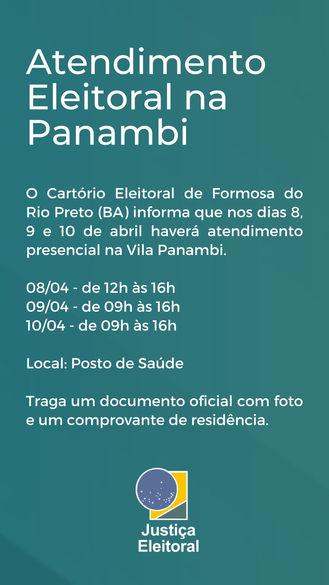 A Justiça Eleitoral do Brasil, por meio do Cartório Eleitoral de Formosa do Rio Preto, realizará atendimento presencial na Vila Panambi nos dias 8, 9 e 10 de abril.