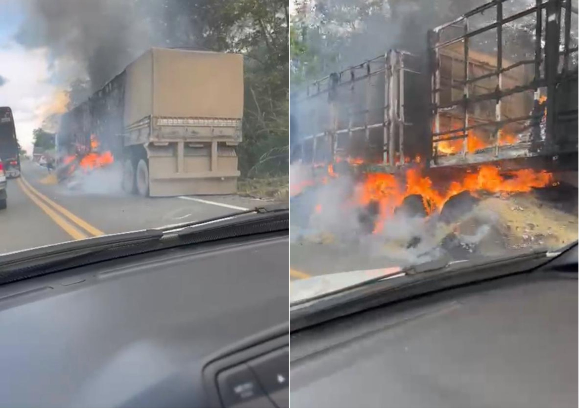 A carroceria do veículo foi completamente tomada pelo fogo, chamando a atenção de quem passava pelo local. Segundo informações, as autoridades foram acionadas para atender a ocorrência e controlar a situação.