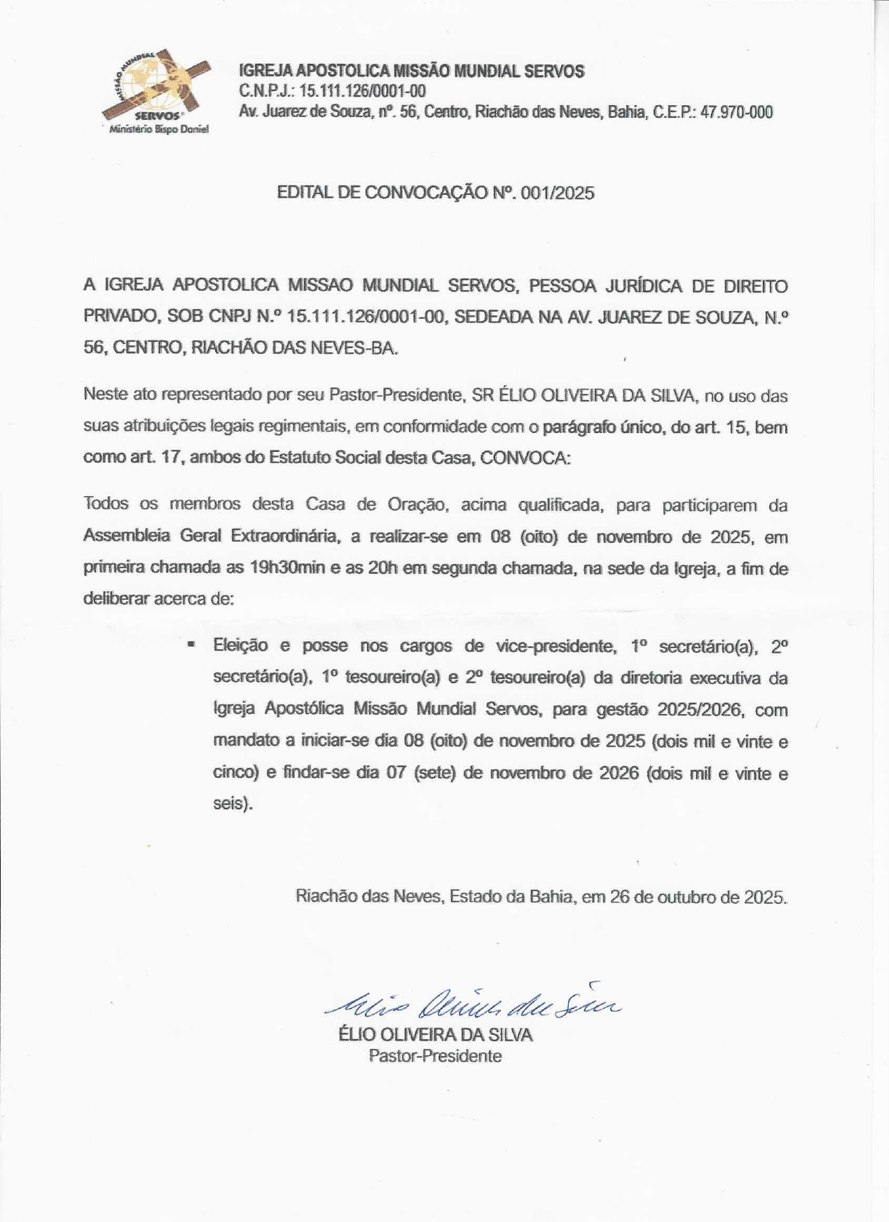 Edital de Convocação da Igreja Apostólica Mundial Servos de Riachão das Neves