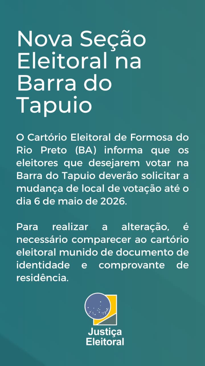 No entanto, o Cartório Eleitoral do município faz um alerta importante: os eleitores que desejarem votar na nova seção precisarão solicitar oficialmente a mudança do local de votação até o dia 6 de maio de 2026.