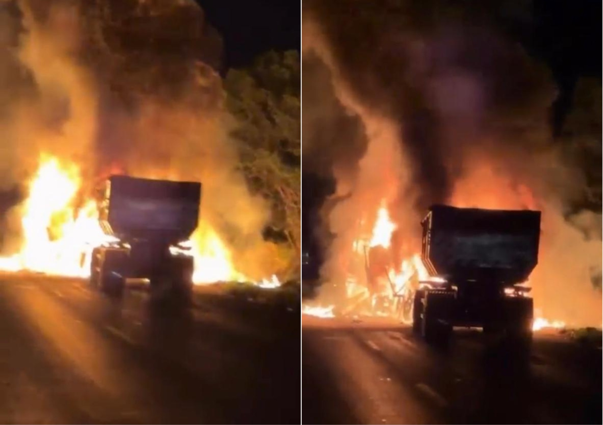 Novas imagens que circulam nas redes sociais evidenciam a gravidade da colisão. O impacto provocou um incêndio de grandes proporções, que destruiu completamente a cabine de uma das carretas envolvidas.
