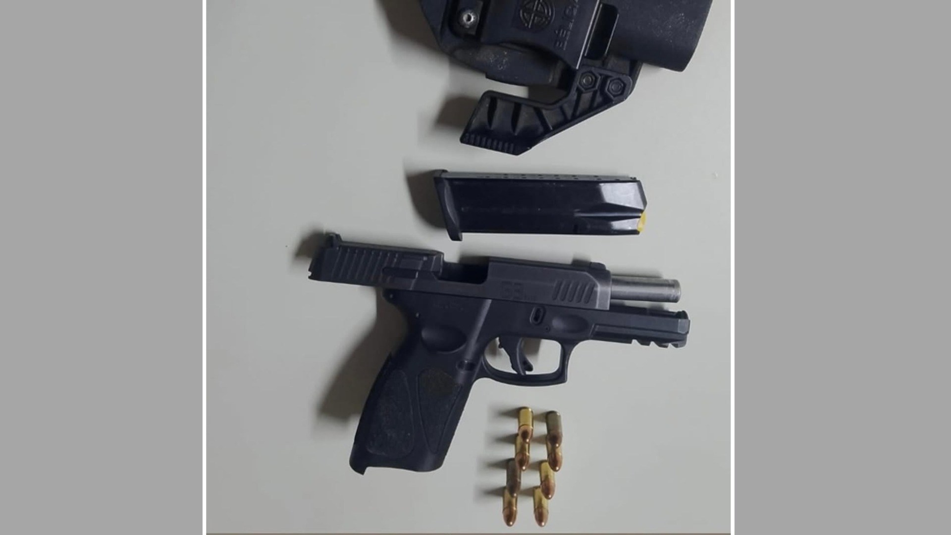 Durante a abordagem, os policiais encontraram uma pistola Taurus G3 Toro, calibre 9mm, municiada com um carregador e oito munições intactas.