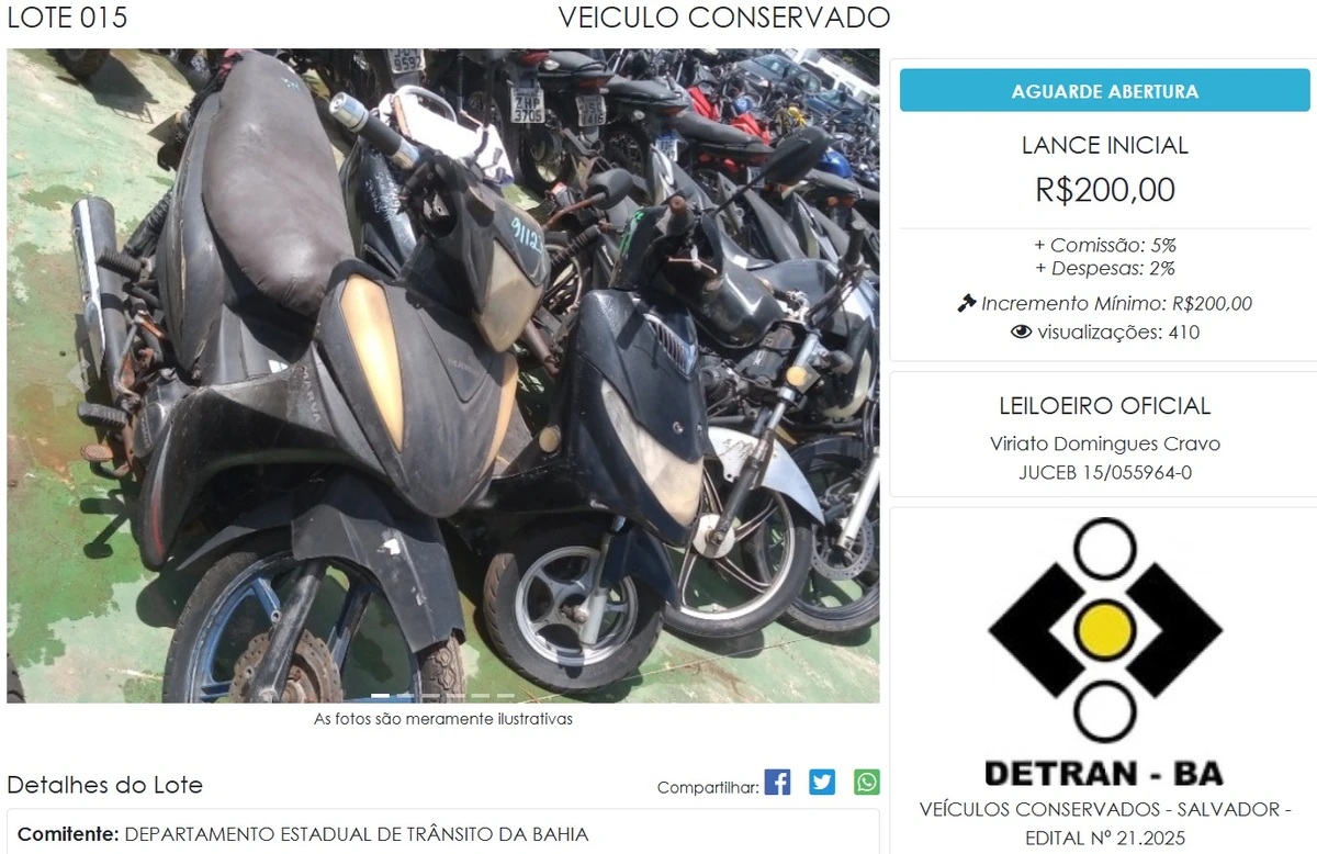 Leilões promovidos pelo Detran-BA reúnem mais de 2,6 mil carros e motos com lances a partir de R$ 200