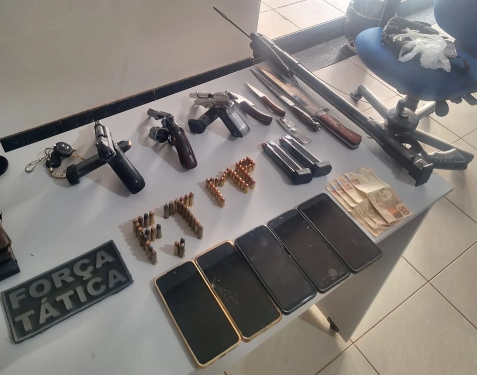 Na vistoria dos automóveis, foram encontradas mais duas pistolas — modelos PT 59s (.380) e PT 58s (.380) — além de 82 munições, sete facas, um arbalete (arpão), cinco aparelhos celulares e R$ 250,00 em dinheiro.