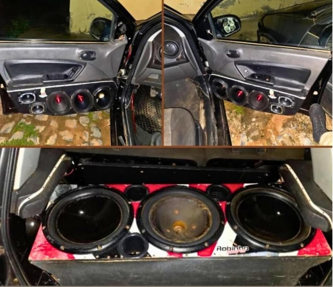 Ao chegar ao local, os policiais identificaram um veículo modelo Ford/Fiesta equipado com sonorização do tipo "paredão".