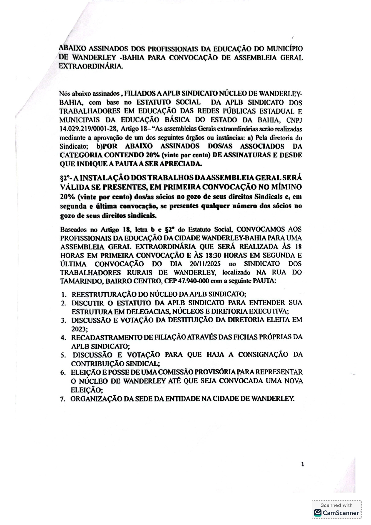 Profissionais da Educação de Wanderley convocam assembleia extraordinária para reestruturar núcleo da APLB