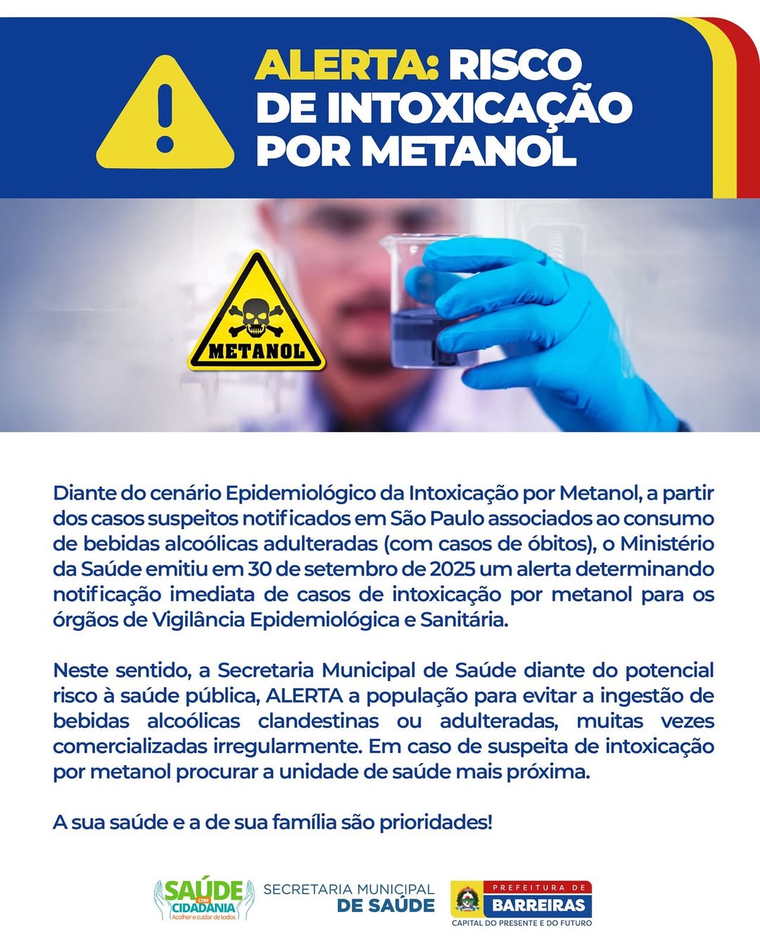 "Diante do cenário Epidemiológico da Intoxicação por Metanol, a partir dos casos suspeitos notificados em São Paulo associados ao consumo de bebidas alcoólicas adulteradas (com casos de óbitos), o Ministério da Saúde emitiu em 30 de setembro de 2025 um alerta determinando notificação imediata de casos de intoxicação por metanol para os órgãos de Vigilância Epidemiológica e Sanitária.