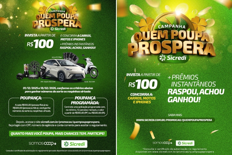 Também com início em 1º de dezembro, a campanha da Sicredi Campo Grande MS segue até 4 de março de 2026 e incentiva a poupança e o uso consciente de outros produtos financeiros que contribuem para a organização financeira dos associados.