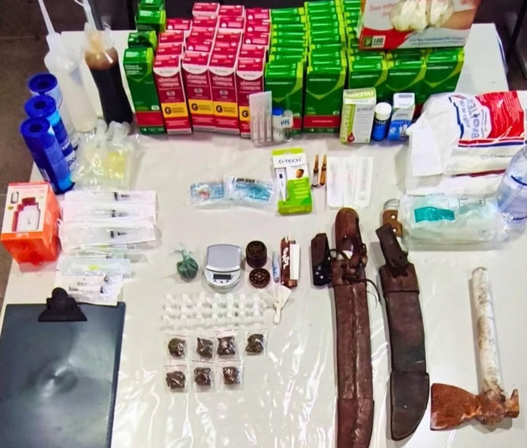 Na abordagem, foram realizadas buscas pessoal e veicular. Segundo a polícia, foram encontrados diversos materiais, incluindo substâncias análogas a drogas e medicamentos que podem ter origem irregular, possivelmente desviados de uma unidade de saúde no povoado de Monte Alegre.