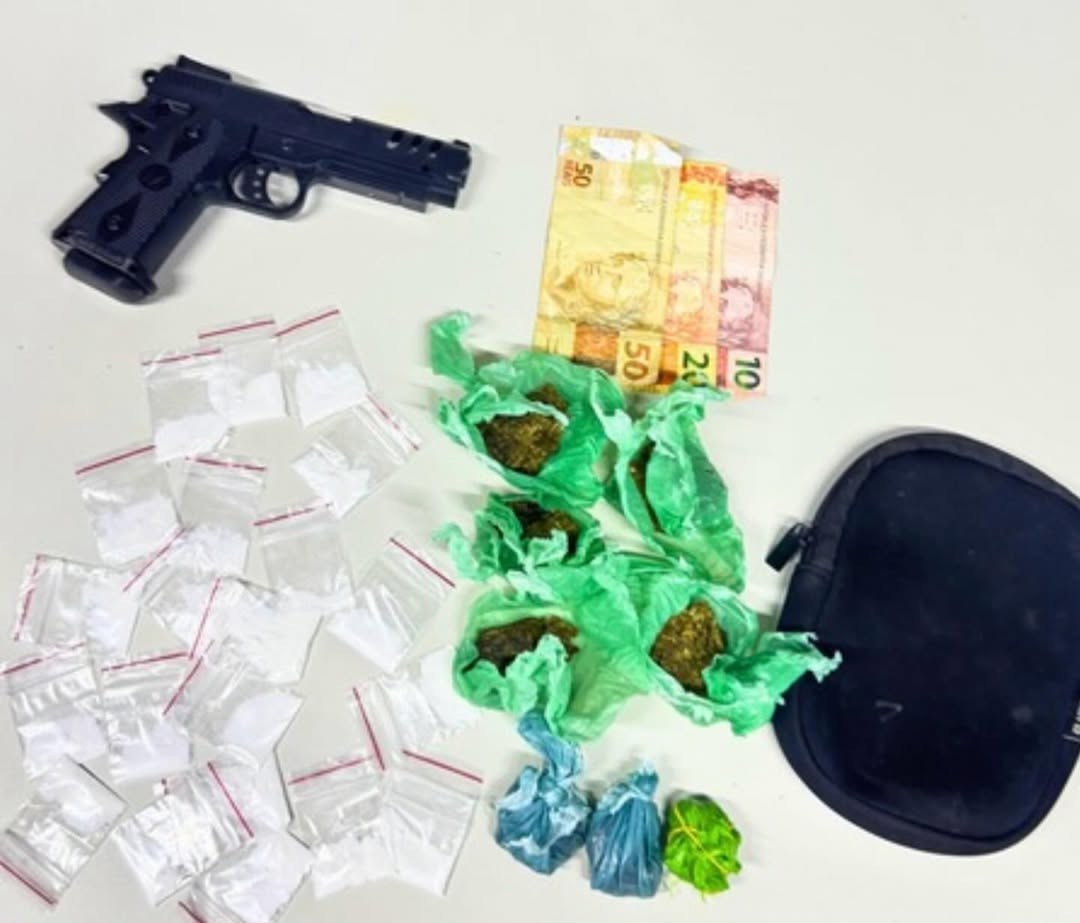 Na sequência, ao revistar uma pochete que ele carregava, os agentes localizaram 21 embalagens contendo substância análoga à cocaína, oito porções de maconha e R$ 80 em dinheiro.